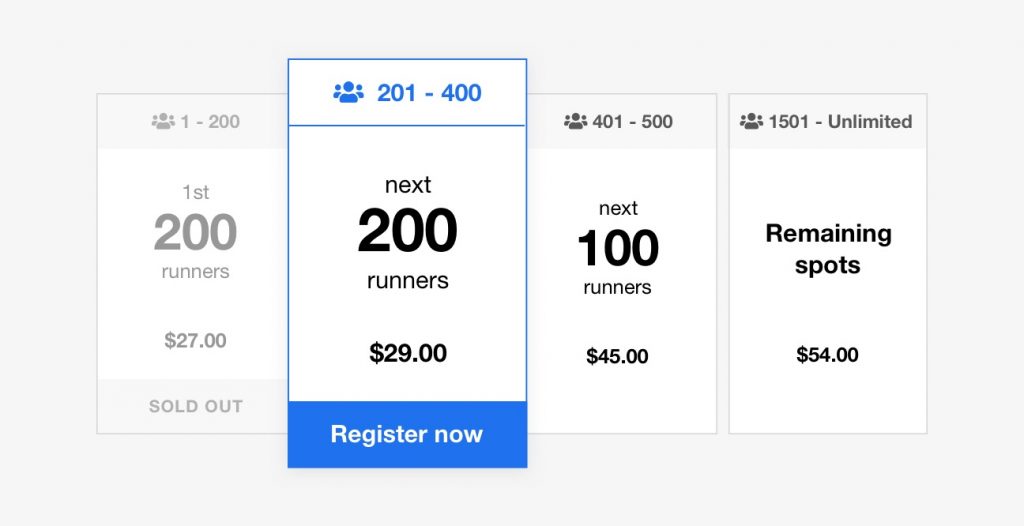 We added block pricing to our existing pricing strategies. Block pricing allows you to tier your pricing based on event demand rather than a specific date and time. Prices jump automatically when the predetermined threshold is meet. Create urgency and increase numbers!