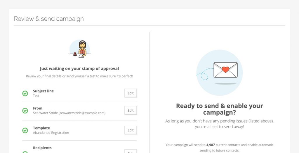 - Campaign send test option: This gives you an opportunity to send a test email to an email address of your choice, previewing before completing the campaign setup