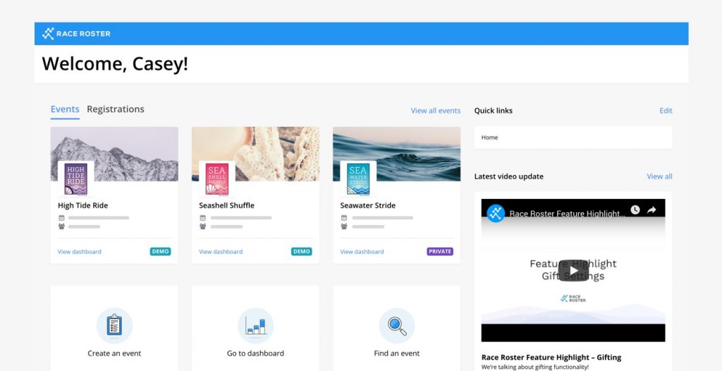 We updated your home page. As an Event Organizer, you have the capability to view all of your events, create an event, view major product releases, read up on the latest articles, have easy access to our Knowledge Base, set-up quick links, and more, all one page!