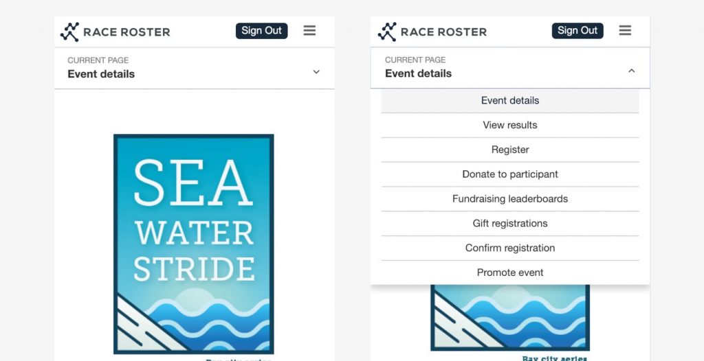 We revamped our mobile registration menu to include a mobile-friendly menu that allows for quick links to “fundraise”, “transfer”, “gifting”, “volunteer”, and other actions depending on the event configurations.