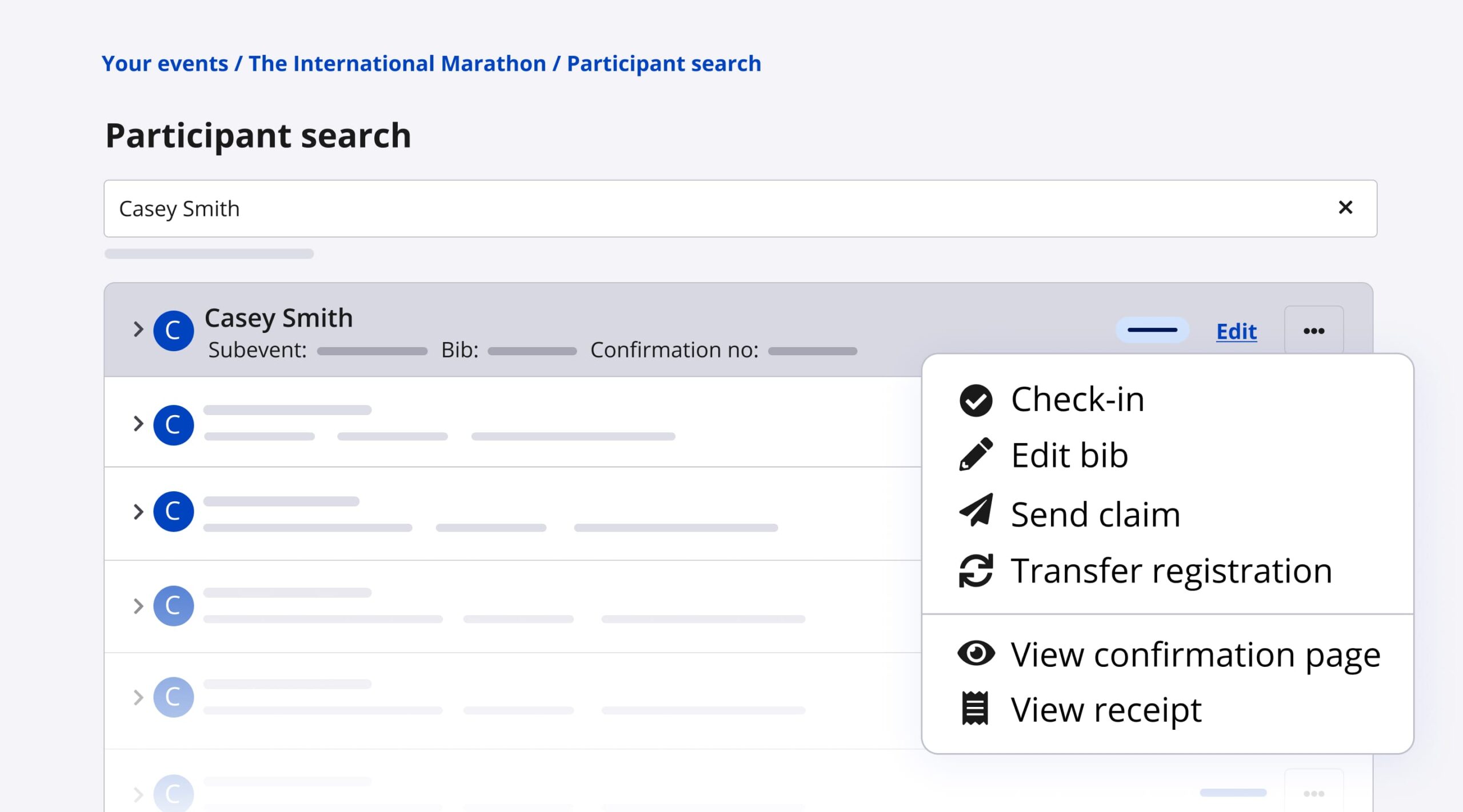 Start typing your participant’s name, email, bib, or confirmation number to search – no setting or field selections required!
