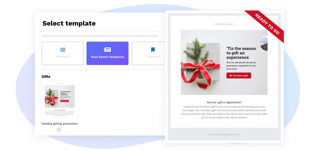 Our goal is to save you time, which is why we have a pre-designed template awaiting your activation. When creating an email campaign on Race Roster, simply choose “Holiday gifting promotion” during template selection. Now you’re ready to connect with your participants and give them a great gift idea!