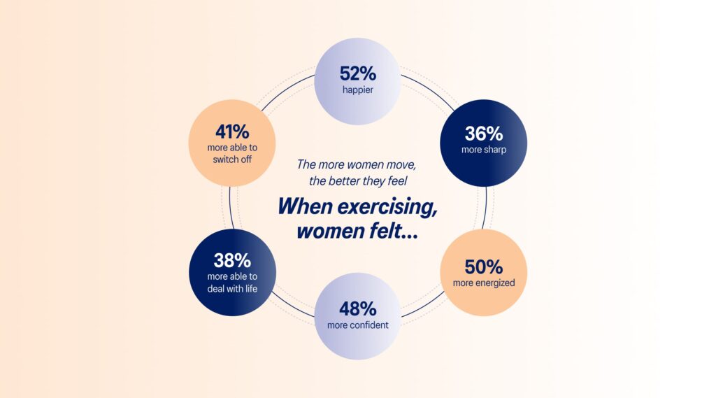 Overall, despite exercising less than men on average, women report wanting to do more, and that activity has a strong, positive impact on their mental wellbeing. Meaning: we have an opportunity.