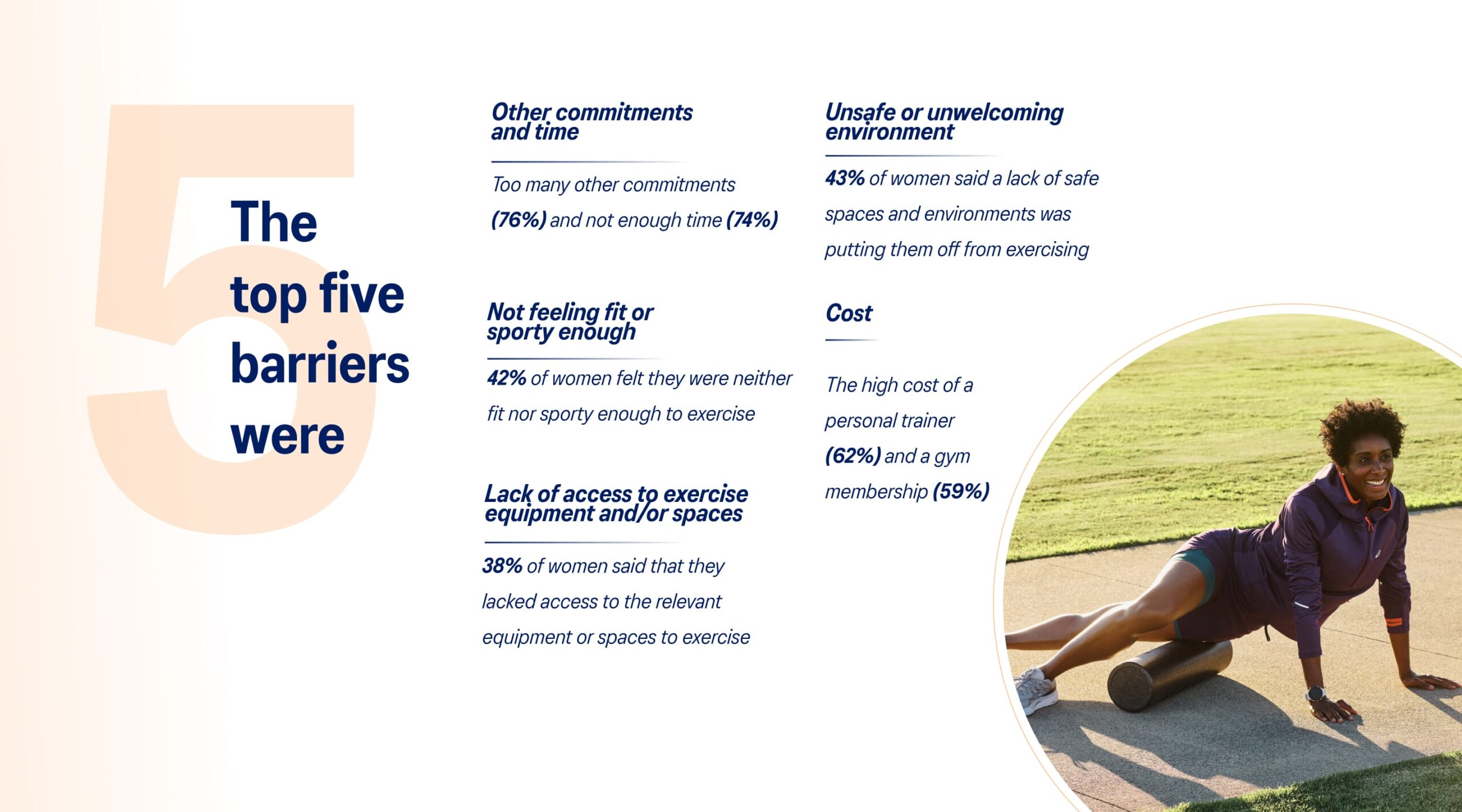 If women report wanting to move, what’s preventing them from doing so? The report summarizes the top five barriers to exercise that women across ages, locations, and activity levels most commonly reported: