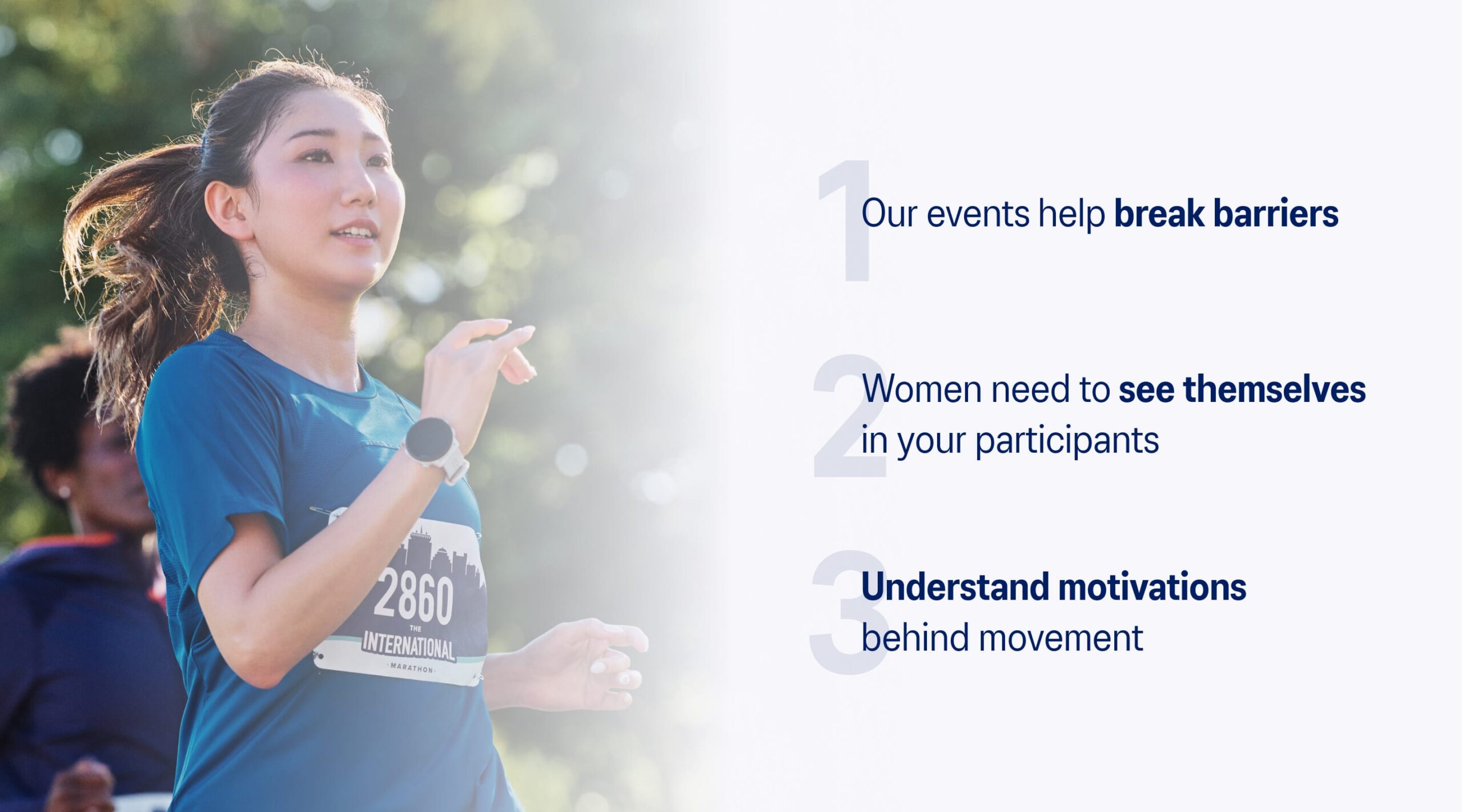 We’re sharing insights from the report specific to you, event organizers, that will not only help increase participation and build a sense of community at your events, but ultimately help break down those barriers that are preventing women from experiencing the emotional, mental, and physical benefits of movement.