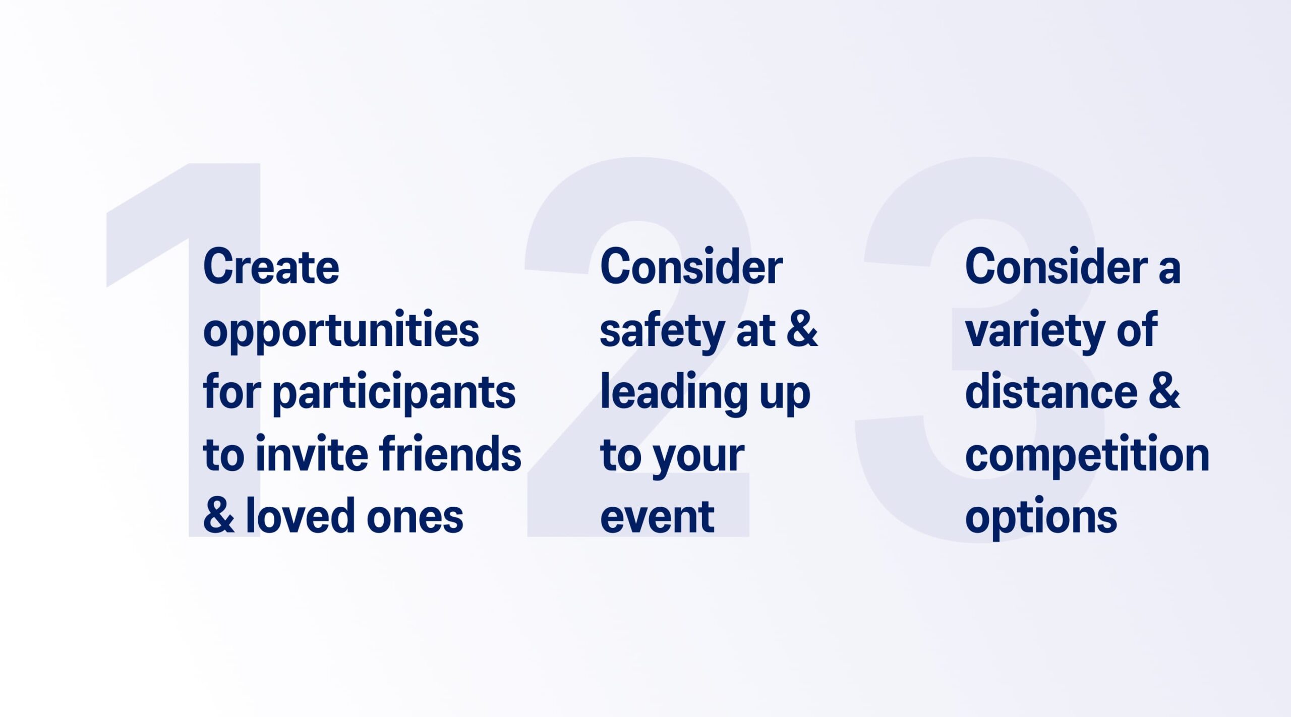 - This could look like a weekly community run, or other type of social events that leads up to event day, providing participants a safe space to train, as well as helping to build familiarity and community between them.