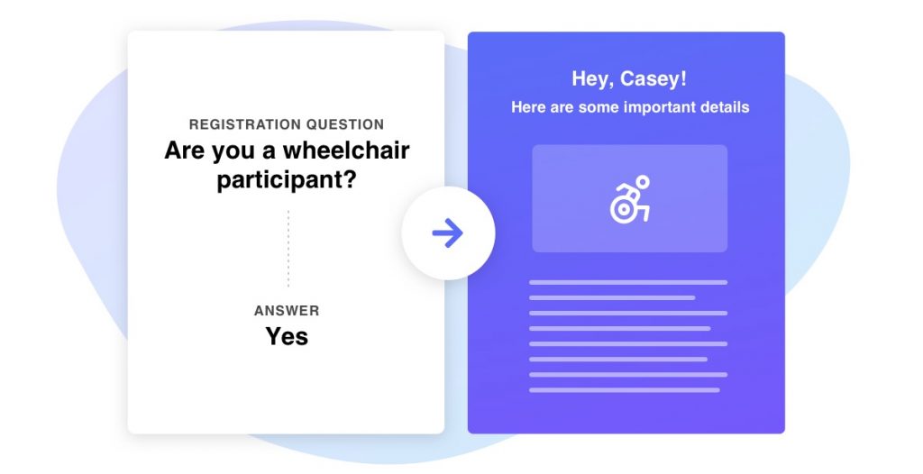 With the questions trigger, you can use the answer to “Do you require a wheelchair?” to create a campaign that automatically sends important accessibility information to those who require it.