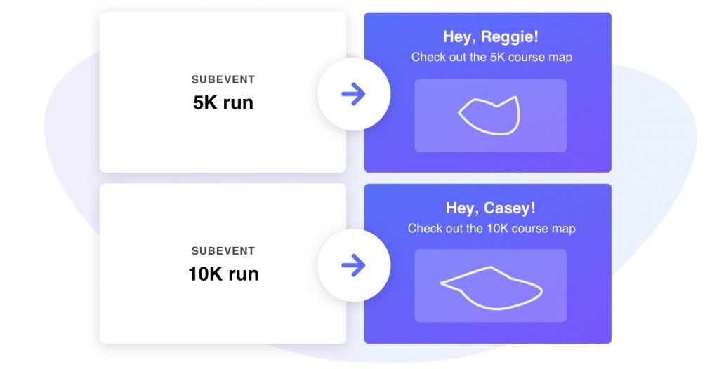 With the sub-event trigger, you can get the right information to the right participants. For example, you could send your 5K runners their unique start time and include a course map of the 5K route. Providing clarity to your runners will ensure a pleasant experience leading up to the event.