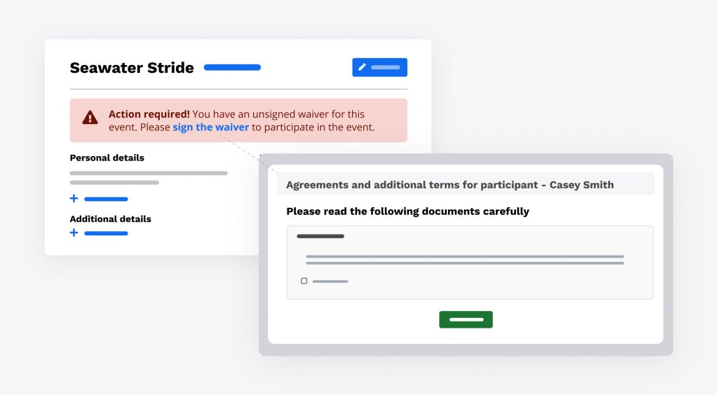 A call-to-action to sign their waiver will also appear prominently on their participant dashboard, making it easy for your participants to determine where to go to sign the required waiver.