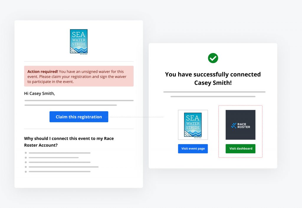 Once a person has registered for someone else, the registered participant will receive an email prompting them to claim their registration and visit their participant dashboard to sign their waiver.