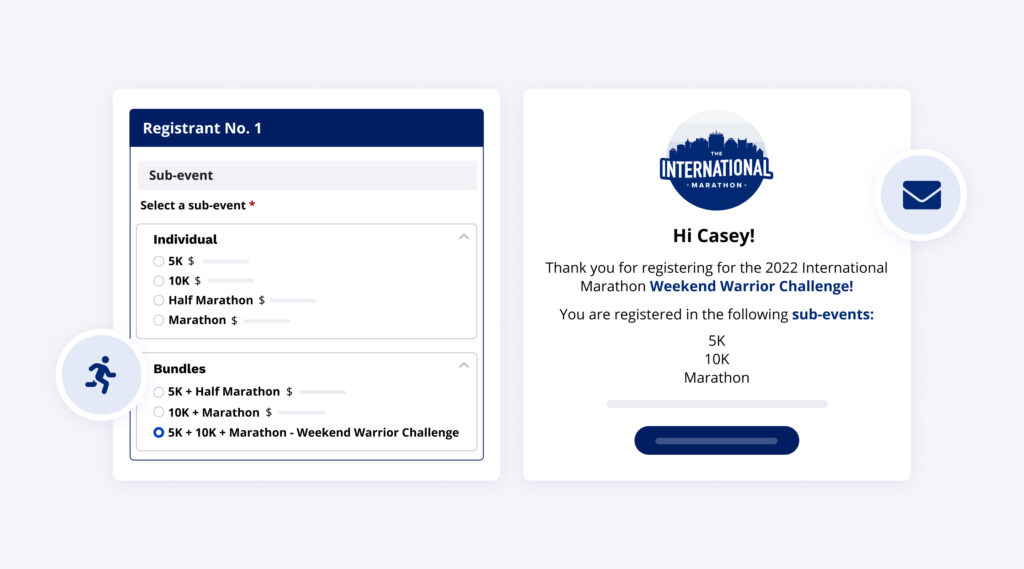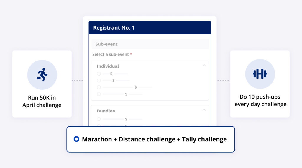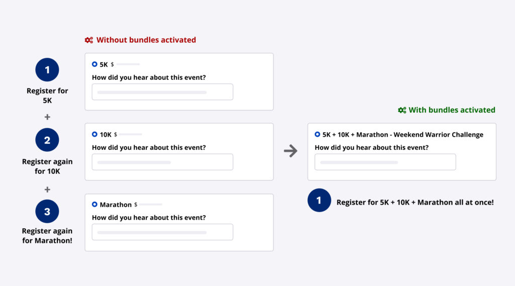 When sub-events are not in a bundle, a participant who wants to register for multiple sub-events will need to fill out a registration form for each sub-event. This means they may end up answering the same questions multiple times and make repeated product selections. You can limit redundancy by grouping sub-events within a bundle, allowing registrants to register for multiple sub–events (e.g., 5K + 10K + Half marathon) in one go. This way, they will only need to answer each question once.