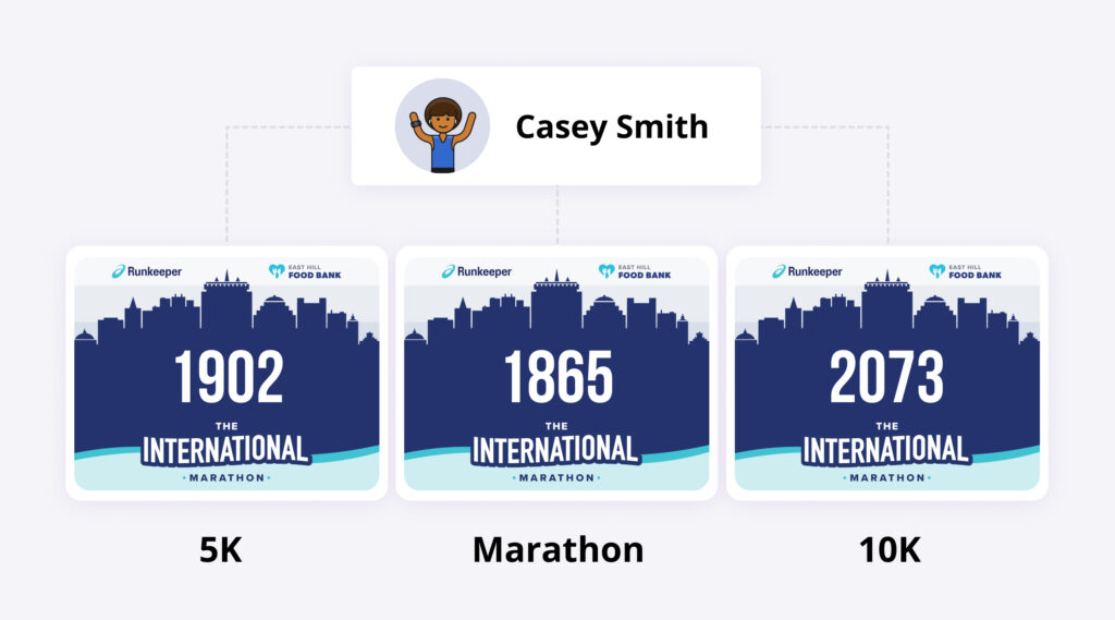 For example, if Casey Smith registers the 5K, 10K, and marathon bundle, the timer will still have separate records of Casey Smith — one for the 5K, and one for the 10K, one for the marathon, as well as one record for the bundle. This will allow the timer to easily assign Casey three different bib numbers.