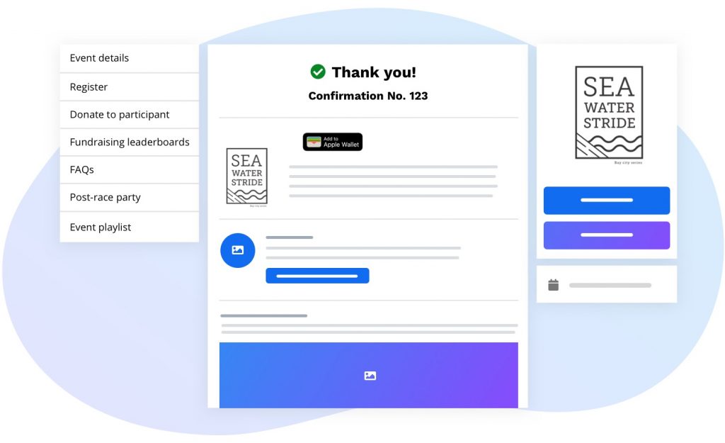 These pages can be beneficial for engaging non-participants because the button to register is displayed on every page. This can encourage people to register as they are reading about your event. You can also include other CTAs (call-to-actions) such as “Donate now” or “Volunteer” to display under your logo on each page.