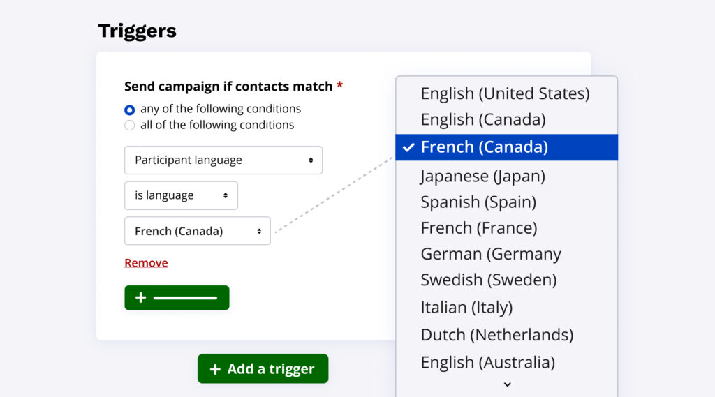 A great way to show your participants that their experience is a priority is to send emails based on language. When setting up your email campaign triggers, you can select a specific language from the dropdown and it will ensure your campaign only sends to participants who use Race Roster in that particular language!