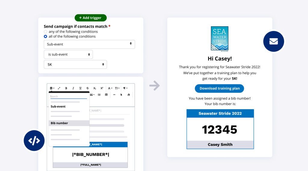 Additionally, you can take your content a step further by including personalized merge tags, such as “first name“, “registered sub-event“, “bib number“, “confirmation number” and more!