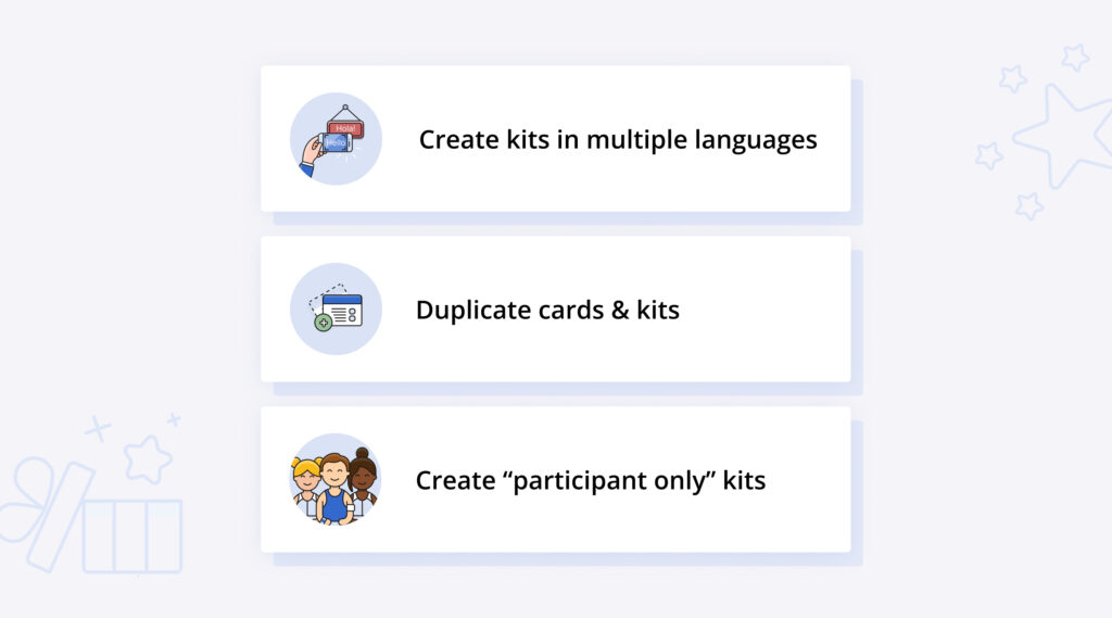 - Duplicate cards & kits – Want to create another card or Digital Engagement Kit with similar content to an existing one? You can now easily duplicate cards and kits! Simply tap the ellipsis icon on a card or kit and select “duplicate”.