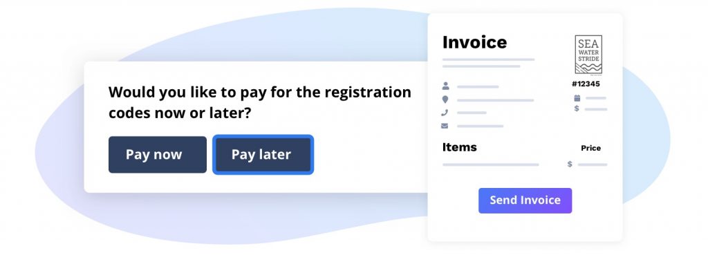 Registration code buyers can choose to pay at the time of purchase, or choose to pay later by invoice or cheque. If they select the option to pay later, an invoice will automatically be created for the event organizer to send out to the buyer.