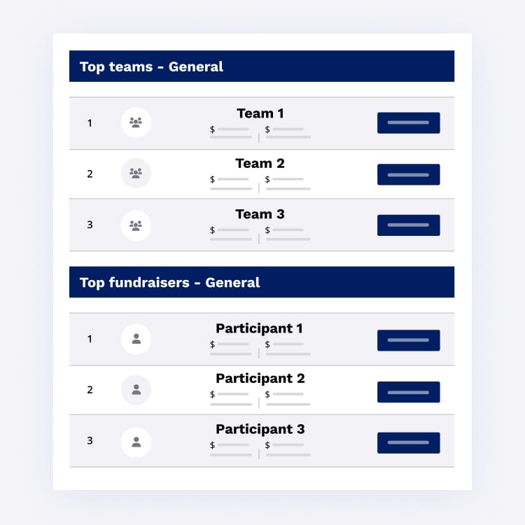 Use our individual and team fundraising leaderboards to highlight your top fundraisers.