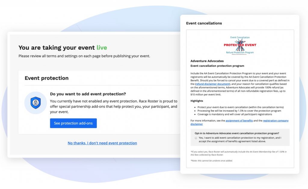 Every event organizer is given an opportunity to enable Adventure Advocates Event Cancellation when they are taking an event live. Several reminders and opportunities to add the protection are also shown during the go-live process.