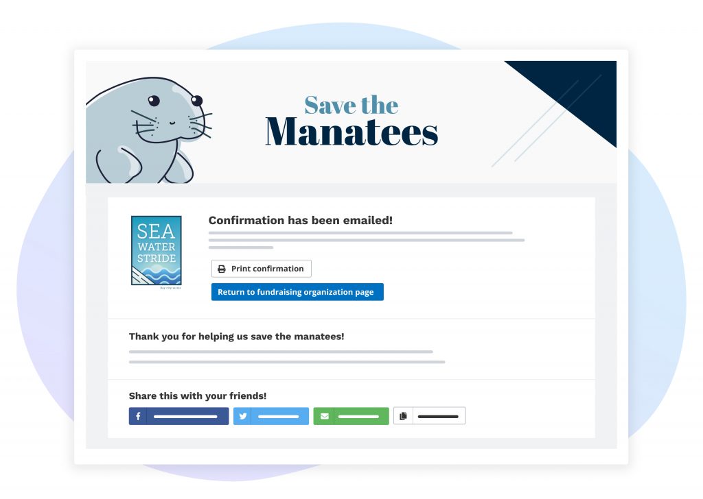 Once a donation has been made, the donor will be directed to your “fundraising thank-you page”. This is a great place to express your gratitude and encourage donors to spread the word about the cause with friends and family.
