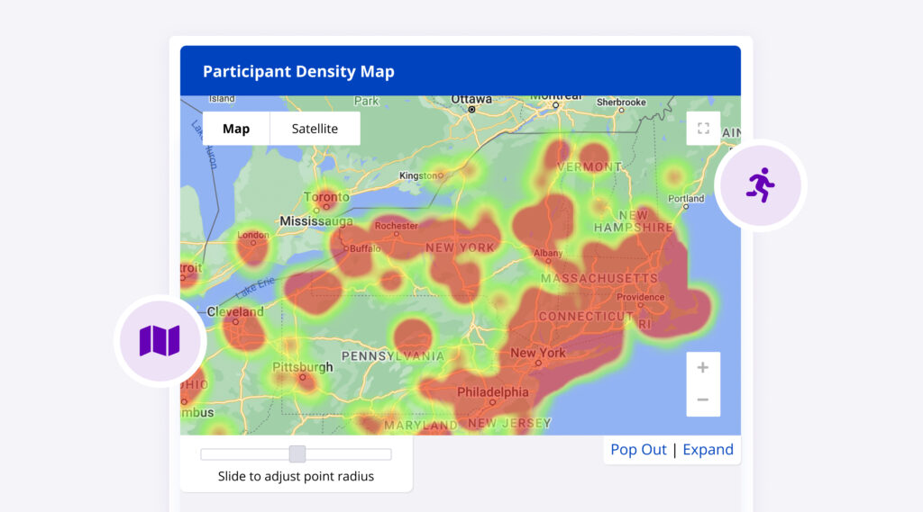 The Participant Density Map visually indicates where in the world your participants have registered from. You can easily toggle between Map and Satellite views, expand to a larger or full screen view, and adjust the size of the point radius.