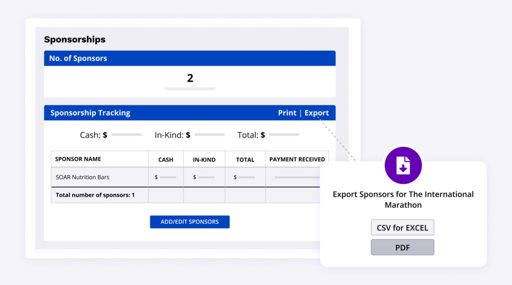 It’s important to keep tabs on sponsorship data. You can see a variety of metrics right from your event dashboard home. This includes total number of sponsors, names of sponsors, In-kind, cash, and total sponsorship dollars received. It’s also quick and easy to print and export sponsorship data to a CSV or PDF!