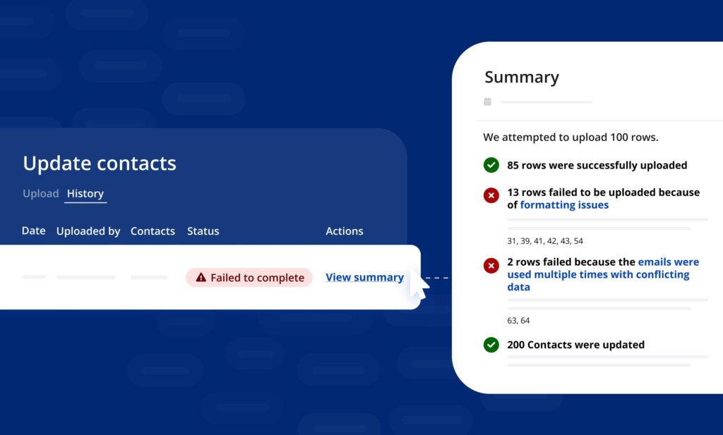 Once your upload is complete, our system automatically provides a detailed summary report. It includes the number of rows/contacts successfully updated and any rows that failed, along with error descriptions. This ensures full transparency and helps you quickly address any issues.