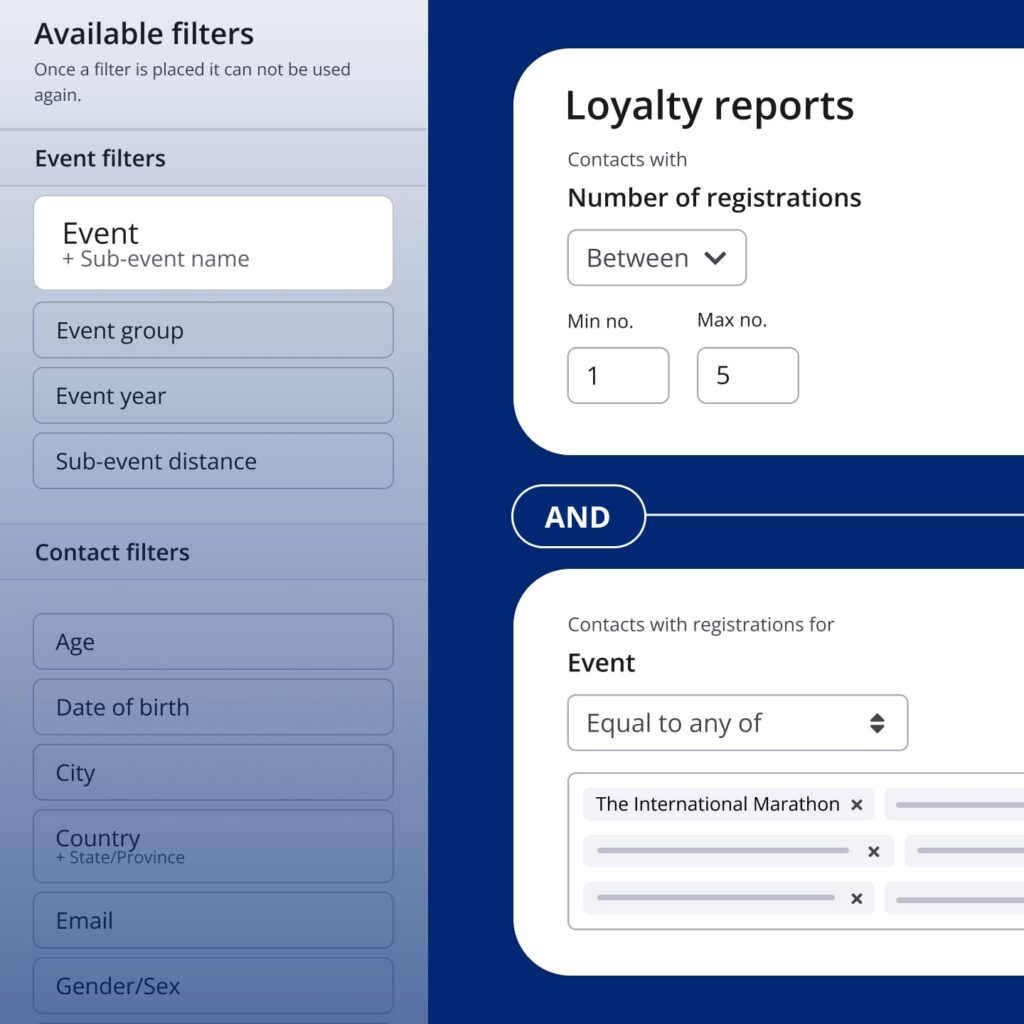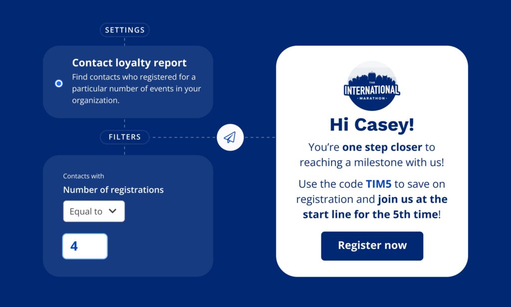 - Boost key campaigns: Create a segment of contacts who have 4 registrations for your specific event, like the 2024 International Marathon, and offer them an incentive to secure their 5th registration.