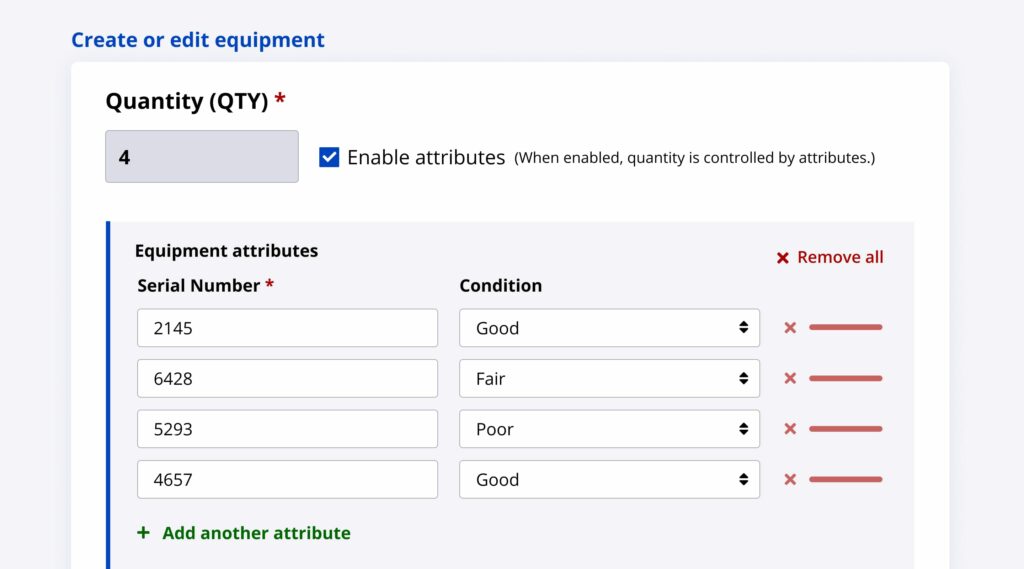 Assign a condition to individual items in your inventory by checking off “enable attributes” when creating or editing equipment!
