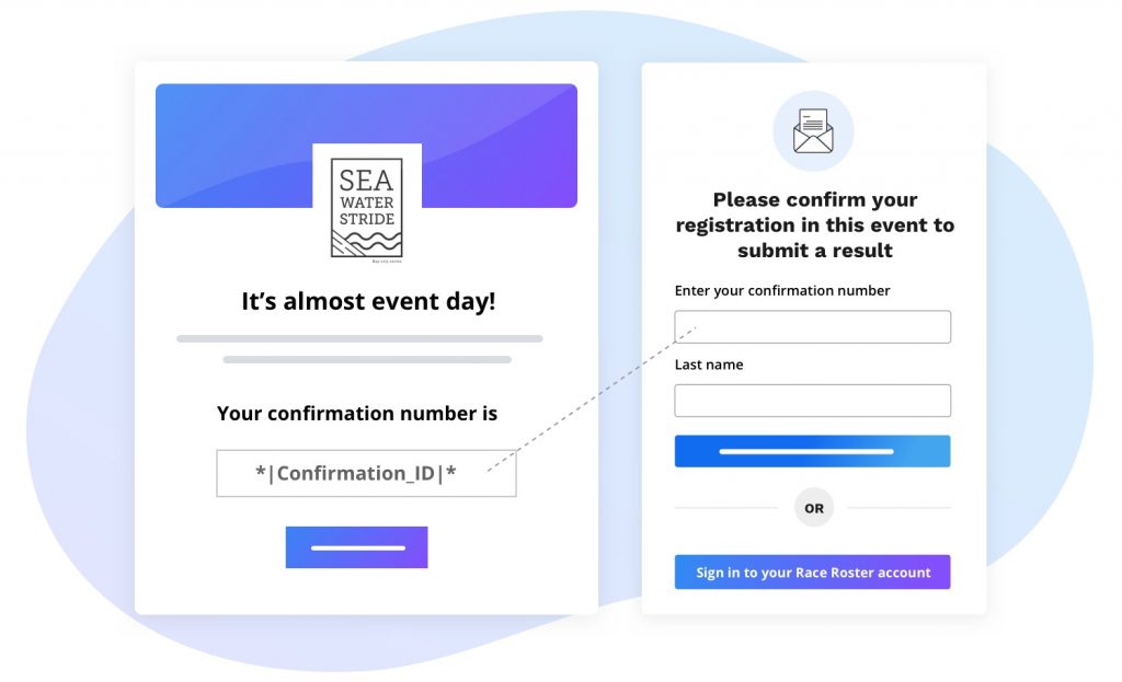 We recommend sending participants their confirmation number using Race Roster’s email campaign tool right before result submission time. You can easily add in a merge tag to dynamically pull in each participant’s confirmation number and display it to the right person. This way, they will have a recent email to reference for a smooth result submission process.