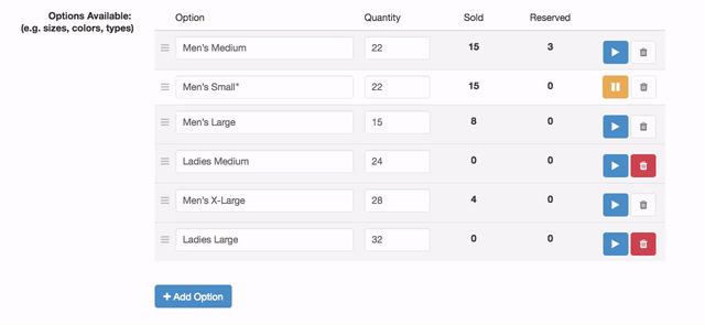 When selling t-shirts, hats, or VIP pasta dinner tickets that have more than one choice (ie. size or color), you can now set limits that reflect your physical inventory for each size or option. This works great if you order your race shirts early or have some old t-shirts you’d like to sell during this year’s registration. We’ve also given you the ability to reposition your sizing options at any time with a drag and drop function.