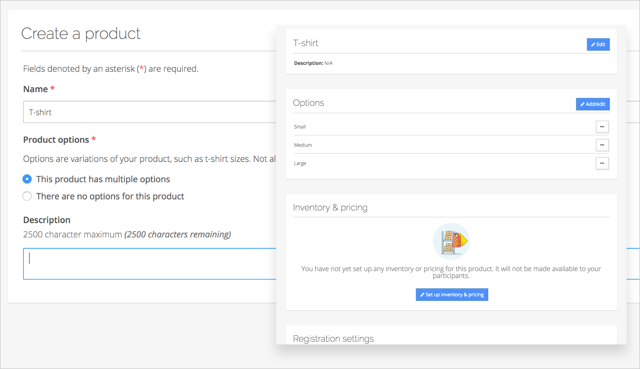 We’ve introduced a new product creation flow when creating complementary and purchasable items. You can configure free, purchasable, or free plus purchase options with inventory limits and sub-event restrictions.