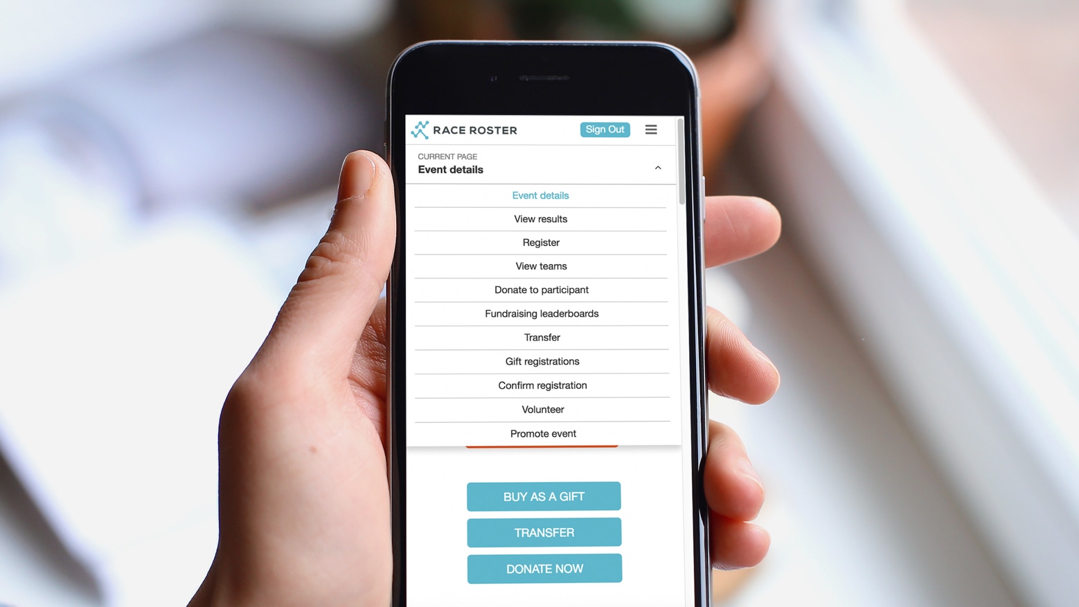 We have revamped our mobile registration menu to include a mobile-friendly menu that allows for quick links to “fundraise”, “transfer”, “gifting”, “volunteer”, and other actions depending on the event configurations.