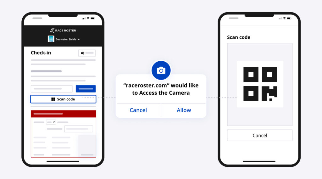 1 – Scan: When it’s time to scan the confirmation code, simply tap “Scan code” on the check-in app, allow access to your device’s camera, and scan the QR code. Every Race Roster confirmation email comes with a unique code that can be pulled up and scanned directly from their phone or a printed piece of paper.