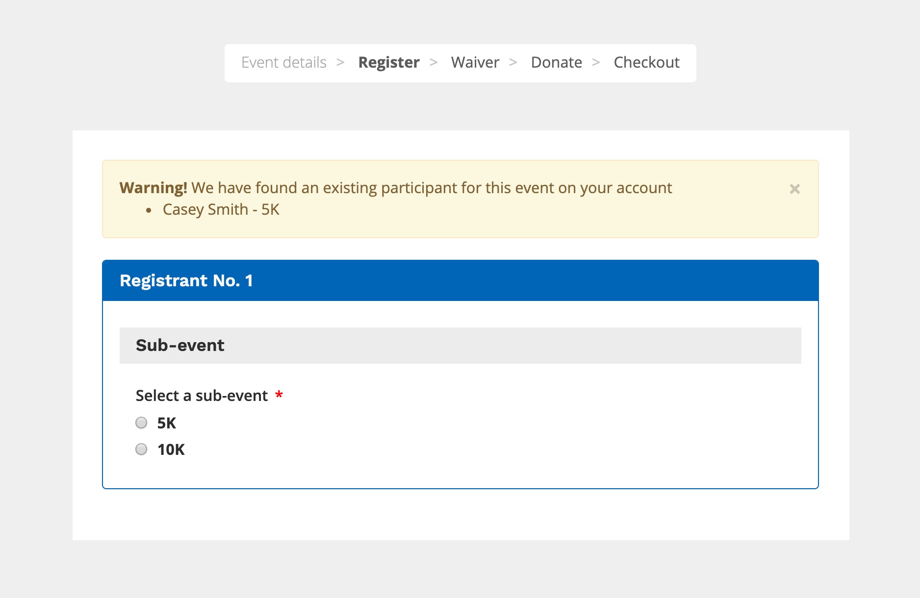 As an active community, we are always on the go. It can be incredibly easy to lose track of something we did months ago – or even yesterday! Sometimes we just need a little friendly reminder, which is why we have introduced a duplicate registration warning to participants who may be trying to register for your event for a second time.