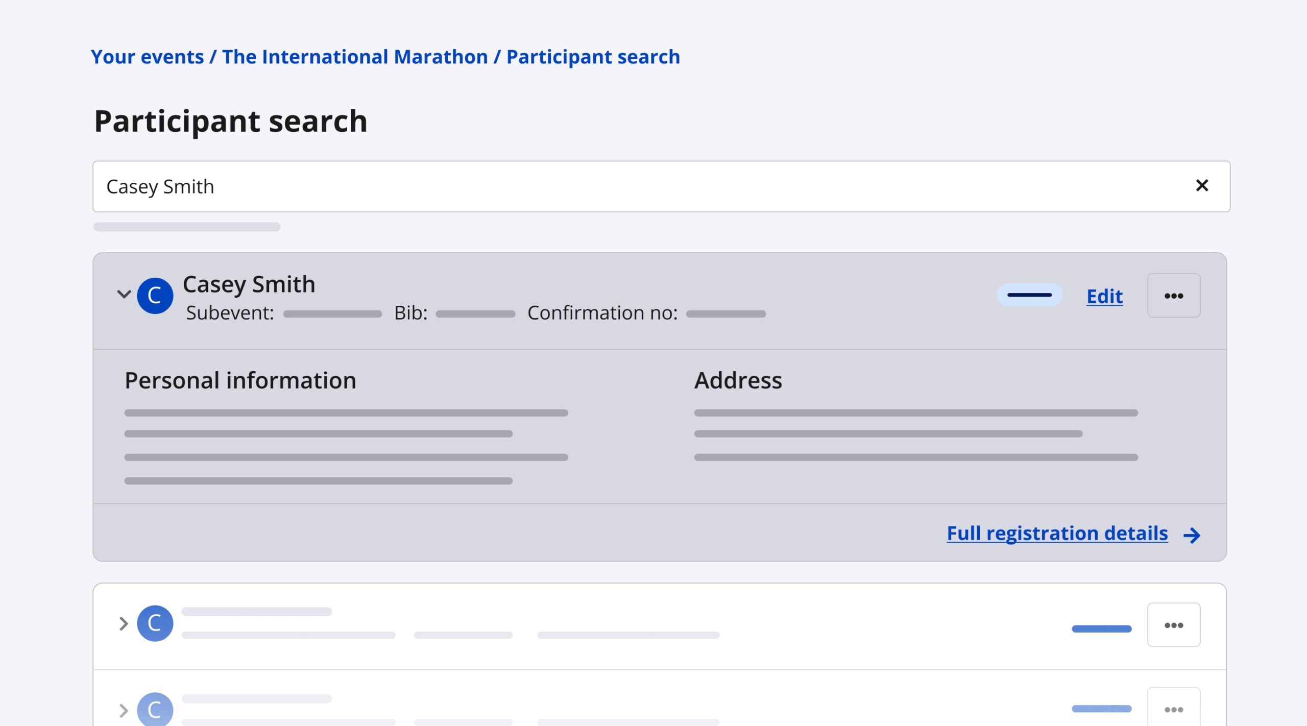 Step 1. Start by typing the name, email address, bib, or confirmation number of the participant you’re searching for.
