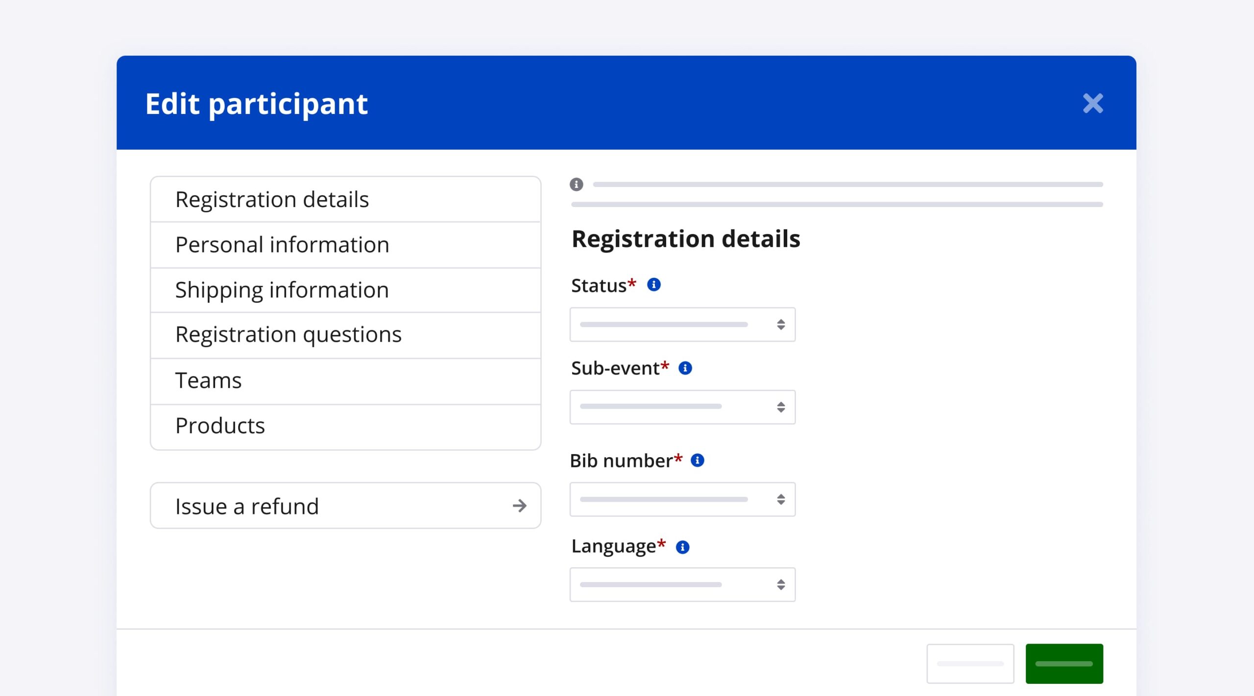 Perform a variety of quick actions on an individual participant such as: check-in, edit bib, resend confirmation, send claim, transfer registration, and view their receipt.