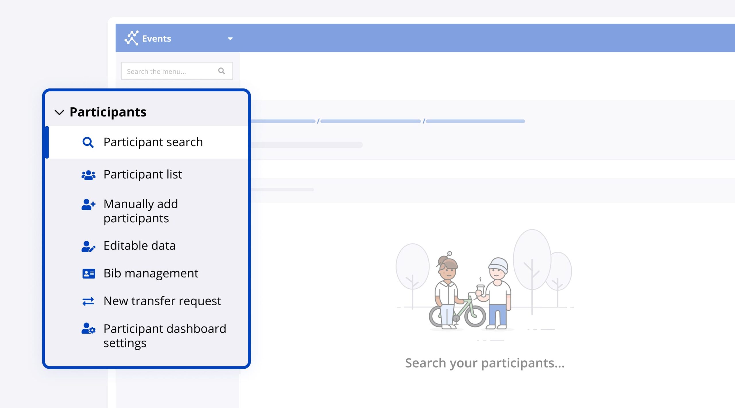 A new sidebar menu called “Participants” is now available on all Race Roster events. Here, you can find the new Participant Search feature, previous participant list, and other participant related menus and reports.