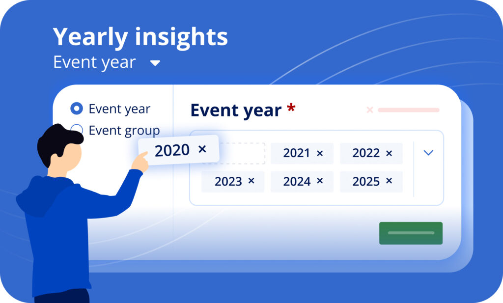 The Yearly Insights Dashboard puts you in control of your data. Filter by event year to compare performance across multiple years, or fine-tune your analysis by adding or removing specific years. Want to focus on a particular series of events? Use the event group filter to uncover registration trends, spot high-performing trends, and areas of opportunity.