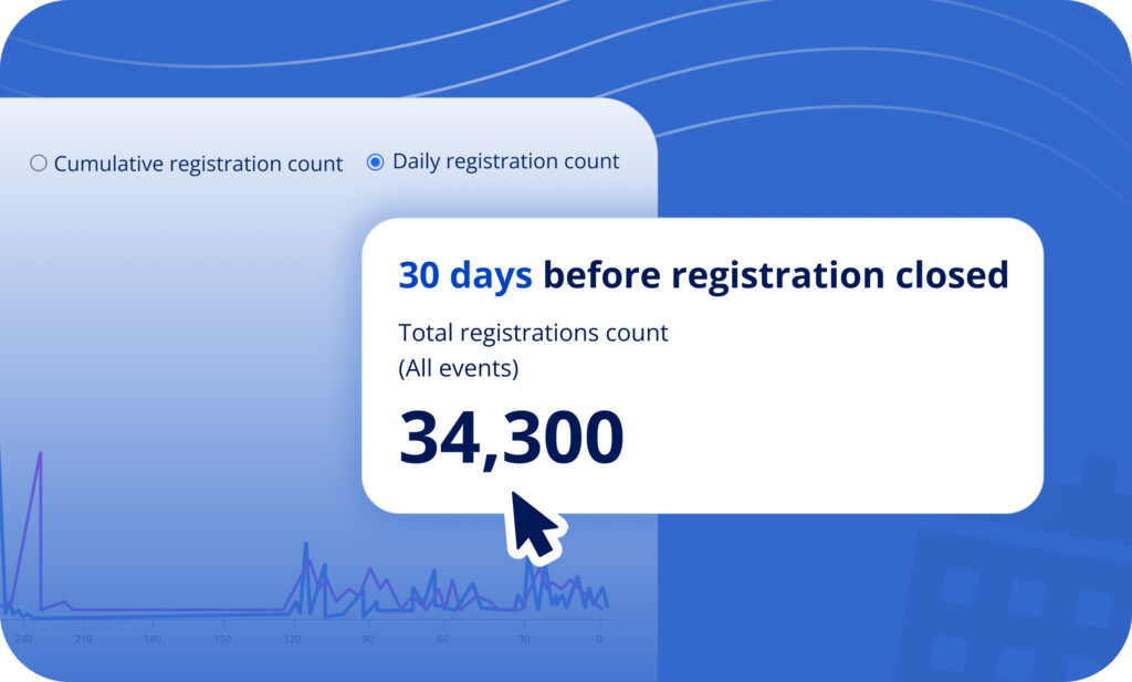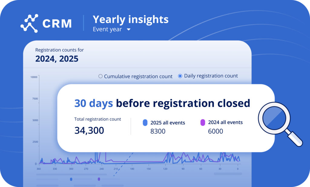 Effortlessly compare event registrations year-over-year and track progress leading up to event day. For instance, see exactly how many registrations you had 30 days out compared to the same point last year. This clarity empowers you to spot trends and make real-time adjustments to your strategy with confidence.