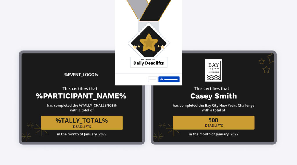 For example, your “January Deadlifts” challenge could use the [%Tally%] merge tag to pull in their total number of deadlifts completed. You can also create your certificate using HTML or by building in our WYSIWYG editor.