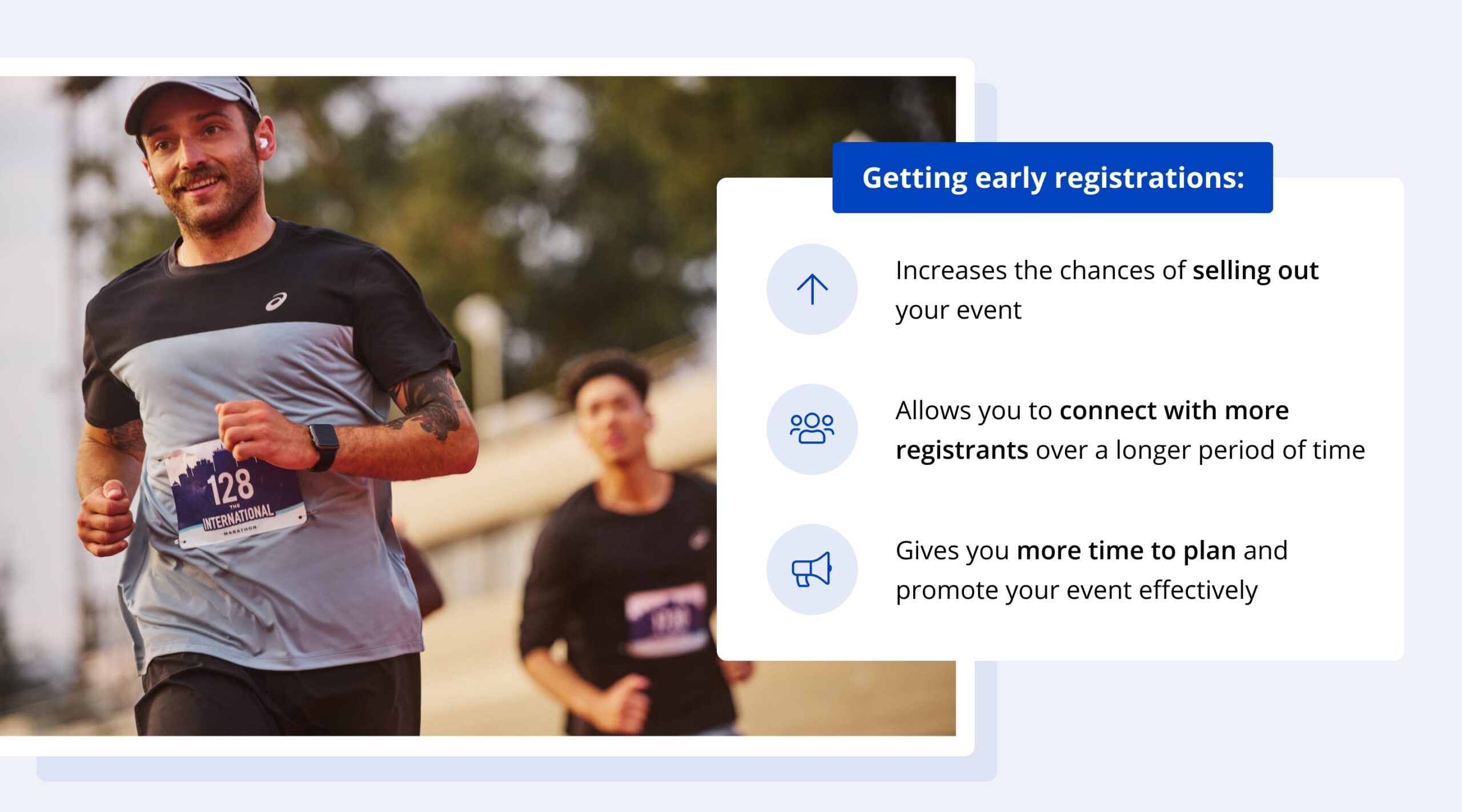 As the event organizer, offering early registration has several benefits. It increases your chances of selling out your event, gives you the opportunity to connect with more registrants over a longer period, and allows you more time to plan and promote your event effectively so you can deliver the best possible experience.