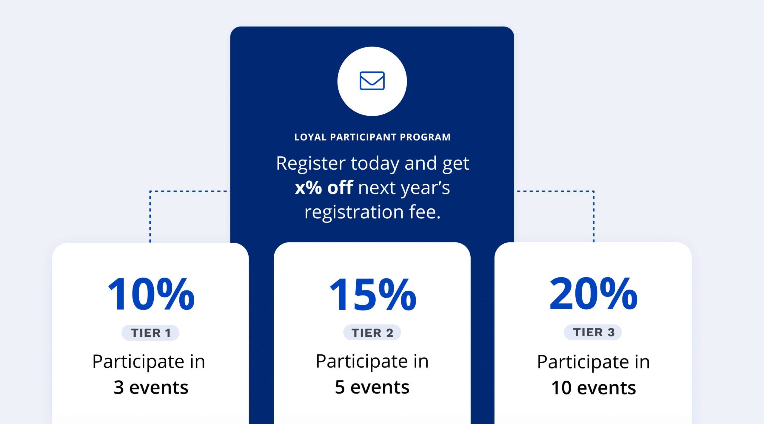 There are a couple of options for loyalty programs: you can offer all past participants the same discount or create a tiered discount program based on how many times a participant has taken part in your event; the more often they participate, the more they save.