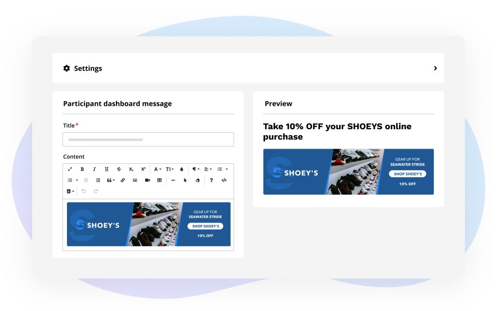The participant dashboard message is a great place to highlight sponsors, drive participants to relevant pages, and communicate important information to your participants. We’ve put together a few examples for each scenario: