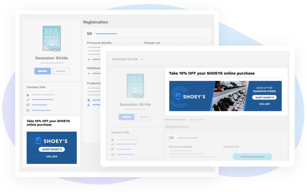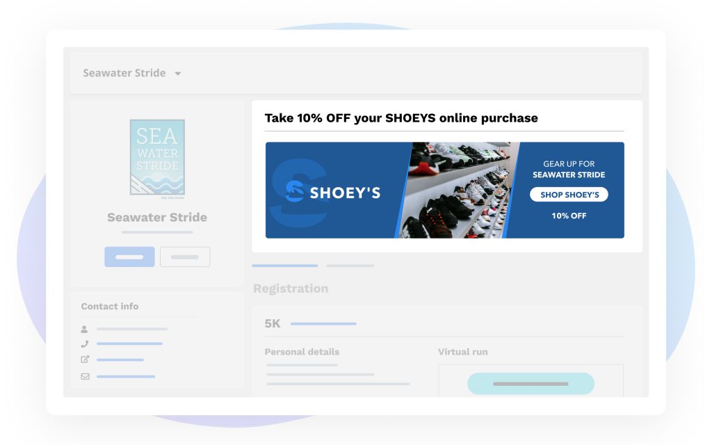 Our custom HTML and image opportunities give you the autonomy you need to display creative and engaging sponsor highlights. You could put together an image offering a discount (e.g., 10% off), driving participants to your run specialty store partner or another sponsor. If you’ve partnered with a run tracking app, this could be an effective area to encourage participants to download and train with the app.
