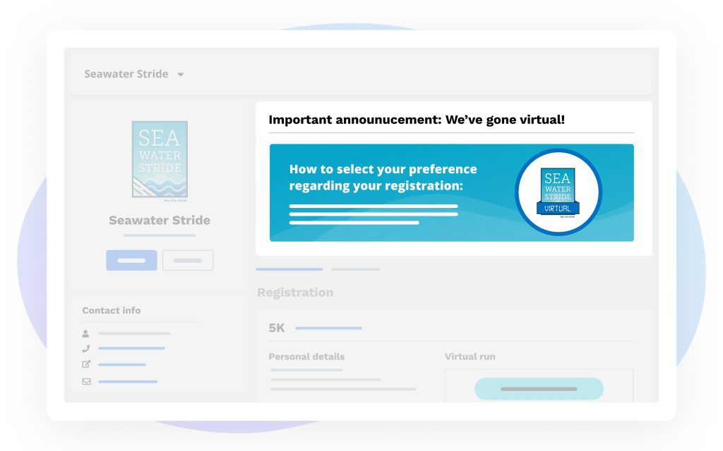 The participant dashboard is a common place for participants to check important event details, making this another great place to announce event changes or other important updates. For example, you could leverage this space to announce that your event has transitioned from an in-person event to a virtual event. The flexibility of the participant dashboard message tool will also allow you to provide details on options, outlining potential next steps and including links for ways to proceed.