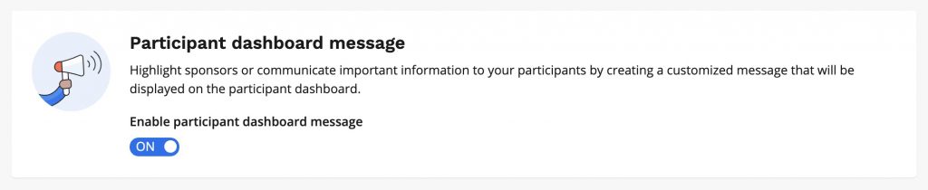 To create a participant dashboard message, visit your event organizer dashboard and search “Participant dashboard message” in your menu. Set the “Enable participant dashboard message” toggle to ON, select your preferred settings, and create your message!