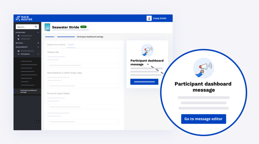 The participant dashboard is the go-to place for participants to see an overview of event information and personal details regarding their registration. As one of the most viewed pages on Race Roster, it’s a fantastic place to communicate important information to your participants! When you visit the new participant dashboard settings page, you will now see a link to the participant dashboard message tool!