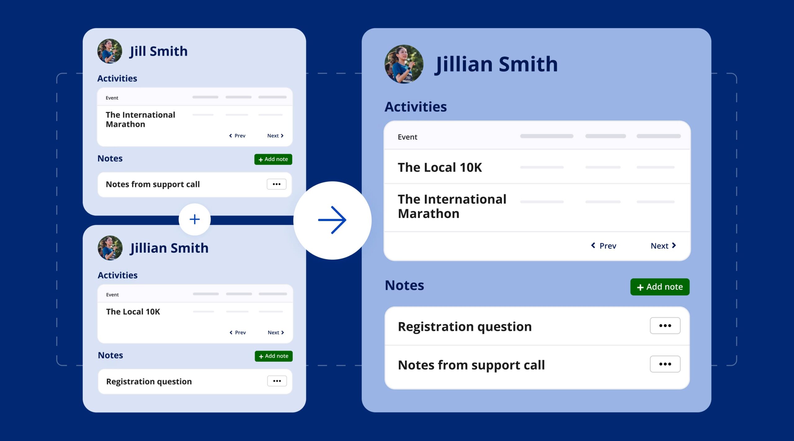Event Organizers can effortlessly eliminate duplicates and manage name changes with our Contact Merging feature. For example, when a participant is registered under variations like “Jillian Smith” and “Jill Smith,” or when “Casey Smith” changes her last name to “Casey Doe”, users can manually combine these entries. This ensures a comprehensive and unified profile for each individual.
