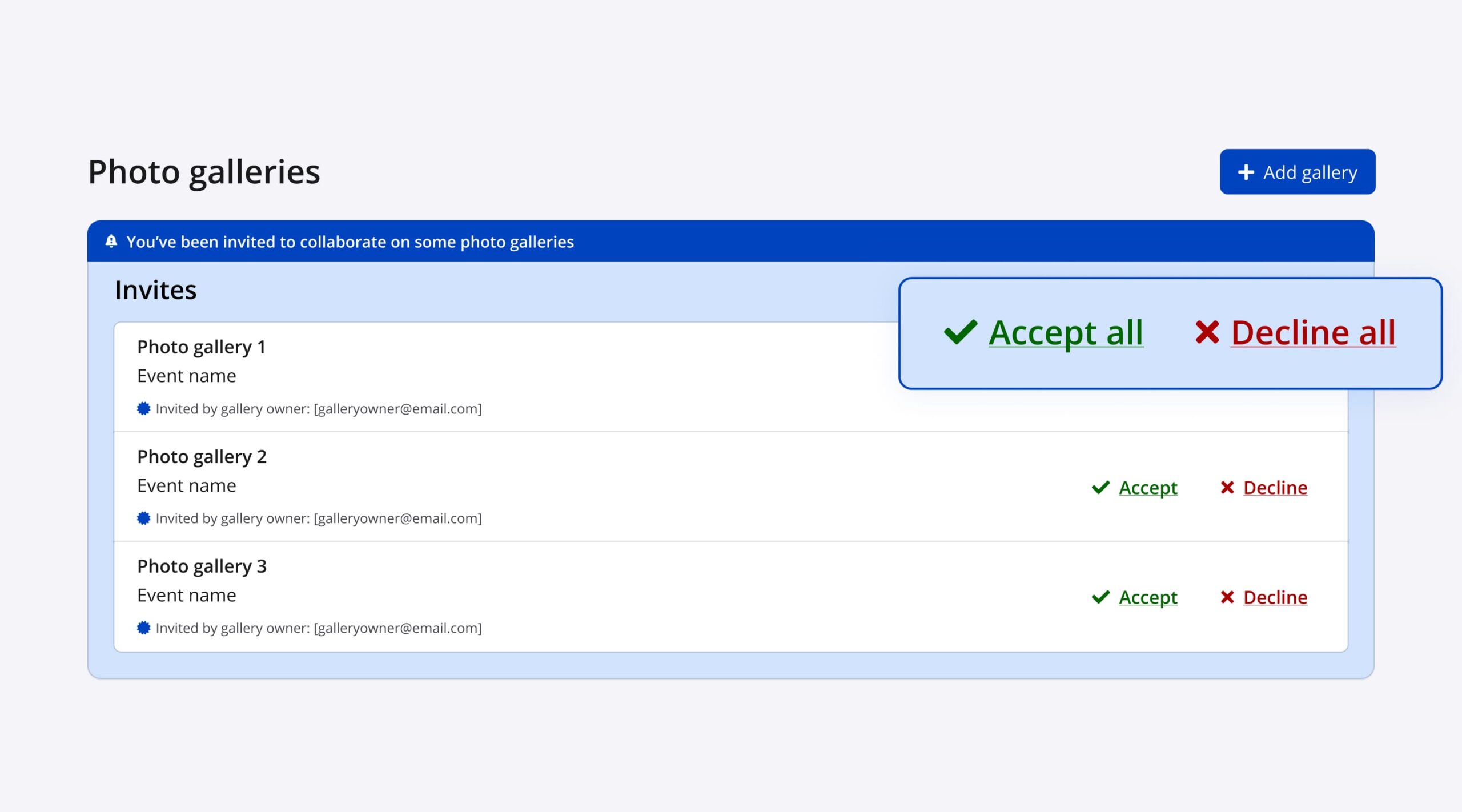 Your collaborator will be asked to sign-in, and if already signed in, be taken to their Photo Gallery page where they can easily view, and accept any pending invitations.